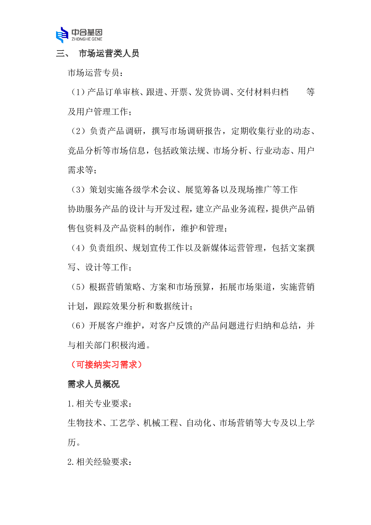 中合基因科技(常州)有限公司人才招聘需求