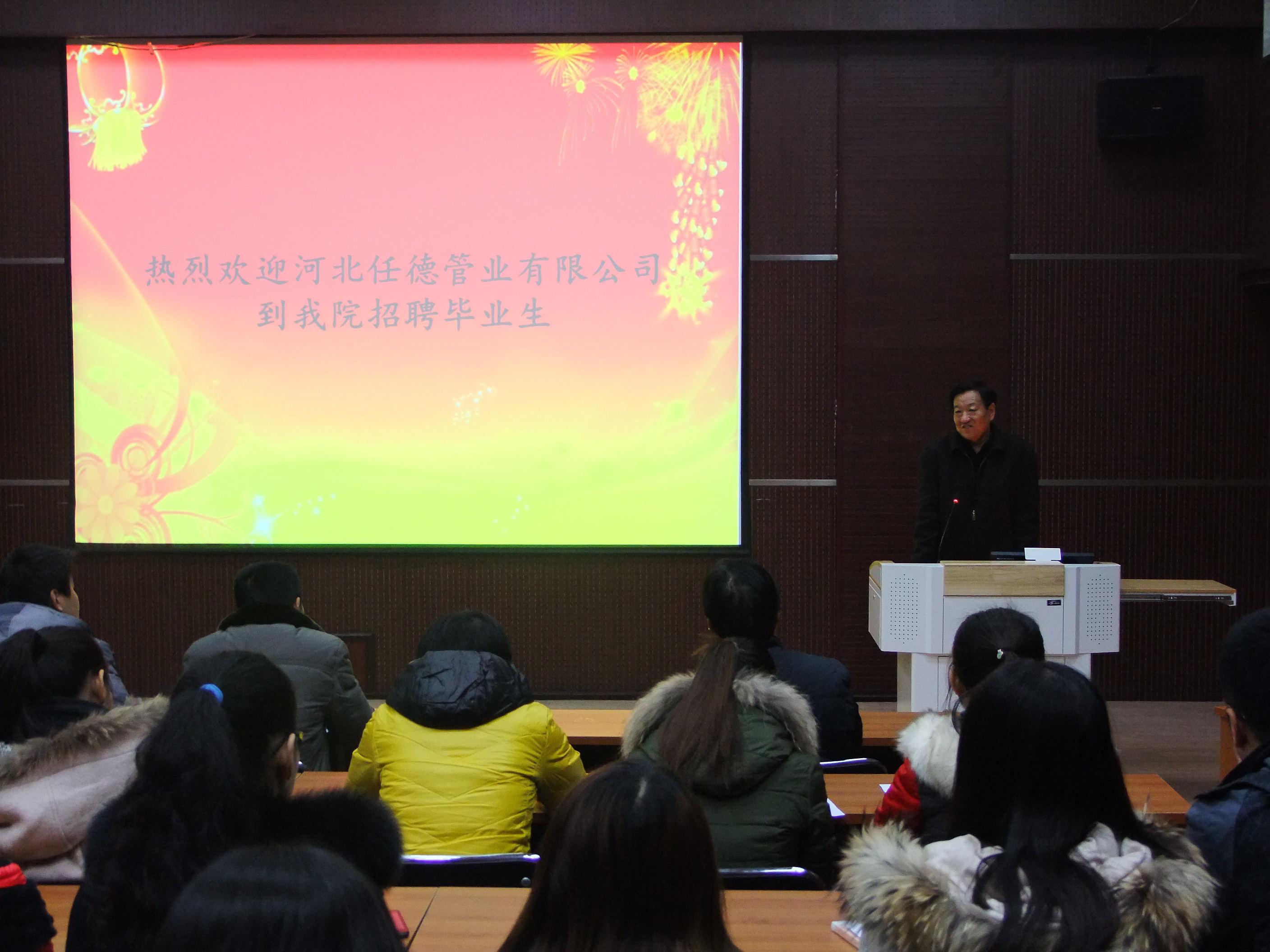 12月24日上午,威廉官网中国官方网站与河北任德管业有限公司在威廉官网中国官方网站MBA教室共同举办大学生招聘会,校党委副书记马振远亲临现场指导就业工作。威廉官网中国官方网站党总支书记李廷湘、院长王春和、就业处副处长张震出席了此次招聘会。招聘会由威廉官网中国官方网站党总支副书记贾喜环主持,我校100余名毕业生参加了招聘会。