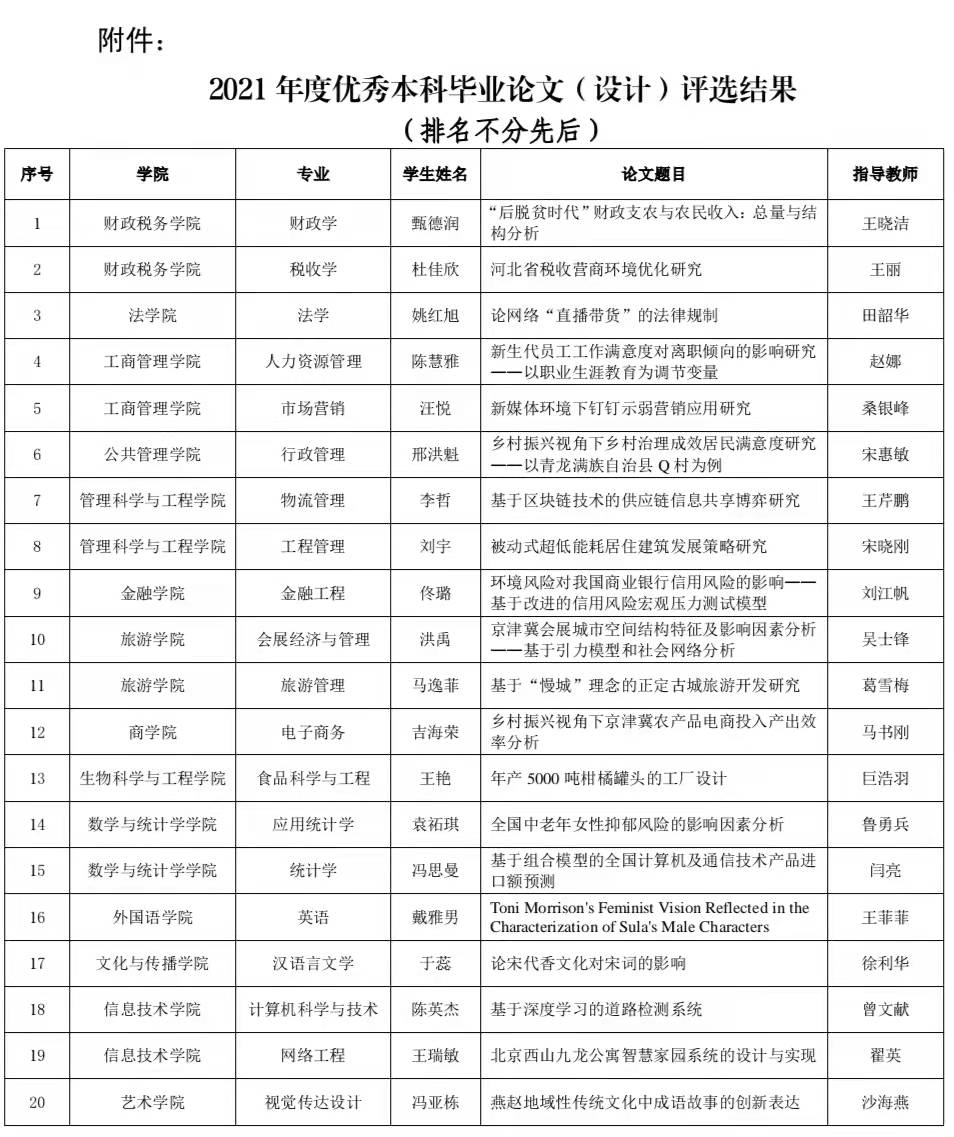 为进一步提升我校本科毕业论文(设计)质量,鼓励毕业论文(设计)指导教师勤勉治学,根据《河北经贸大学普通本科毕业论文(设计)管理办法(2021 年修订)》(冀经贸教〔2021〕59 号),学校于本月组织开展了 2021 年度优秀本科毕业 论文(设计)评选工作,评选出 20 篇优秀毕业论文(设计) 。