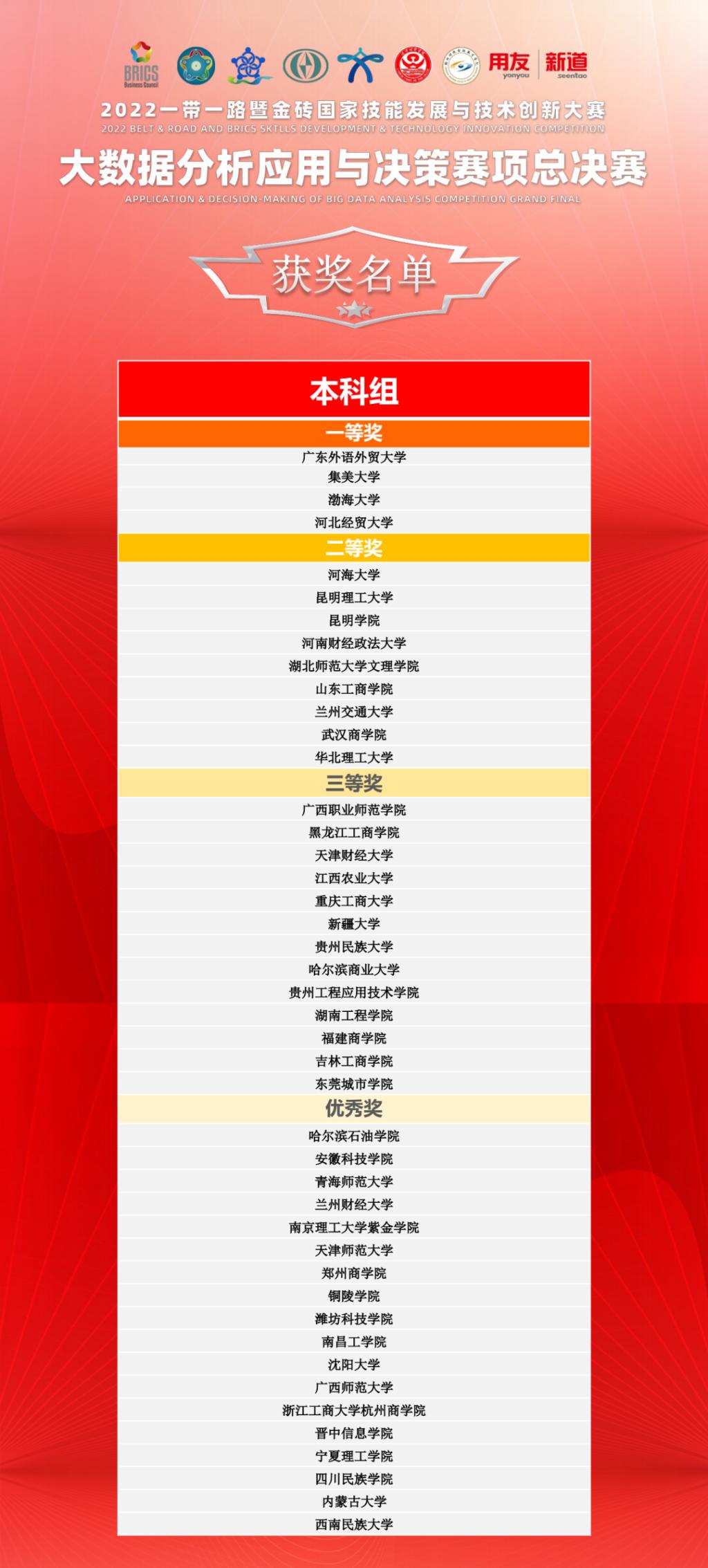 2022年10月23日,2022一带一路暨金砖国家技能发展与技术创新大赛(大数据分析应用与决策赛项)总决赛在线上圆满结束。威廉官网中国官方网站参赛团队在比赛中脱颖而出,荣获全国总决赛一等奖。