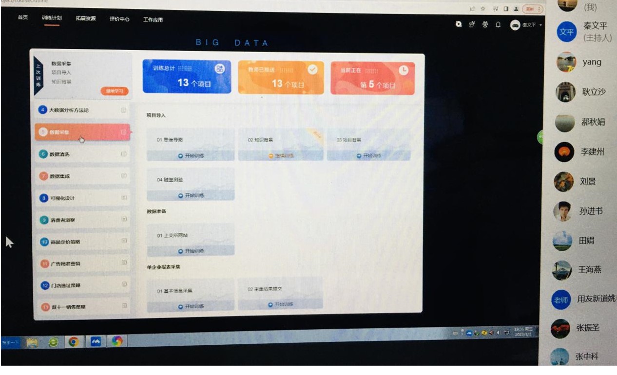 在两个小时的培训过程中,新道公司的两位培训老师对《营销大数据》的13个项目模块(大数据认知、大数据概述、大数据在商业领域中应用、大数据分析方法论、数据采集实战演练、数据清洗实战演练、数据集成实战演练、可视化设计实战演练、消费者洞察、商品定价策略、广告精准营销、门店选址策略)进行了详细讲解和操作演示。重点对数据清洗实战、数据集成和可视化设计三个部分进行了讲解。