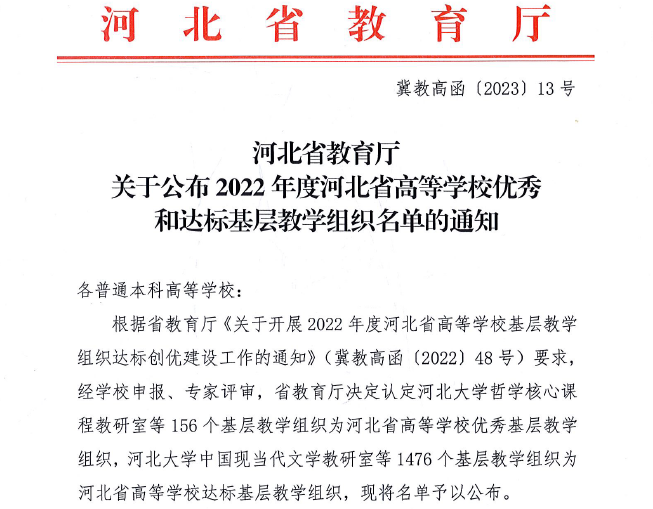 近日,河北省教育厅公布了2022年度河北省高等学校优秀基层教学组织遴选结果(冀高教函[2023]13号),威廉官网“企业管理系”入选河北省高等学校优秀基层教学组织。