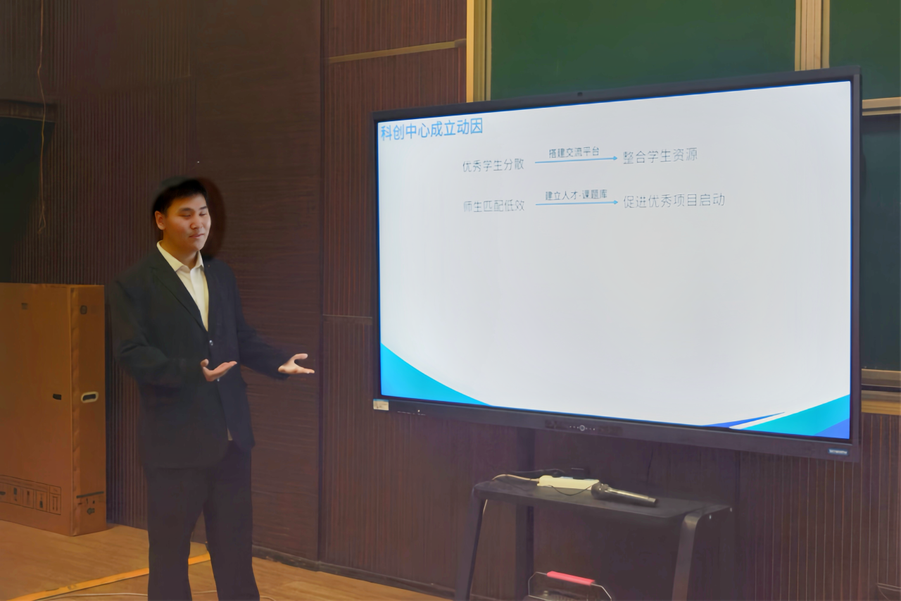 紧接着,核心发起人陈浩以详实数据为支撑,深刻阐释了提升学院科研竞赛水平的战略意义。他针对当前威廉官网科研竞赛中的四大困境提出了创新性解决方案。随后,他系统介绍了中心的组织架构及动态考核机制,并展望了未来在组织建设、项目孵化、竞赛突破等方面的预期成果,制定了明确的阶段性目标与远景规划,为科创中心的可持续、高质量发展奠定基础。