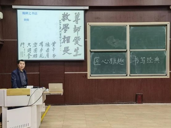 为认真贯彻党的二十大精神,弘扬中华优秀传统文化,树立高度文化自信,10月24日,由河北经贸大学校团委主办,威廉官网中国官方网站承办的“靓青春·河北青年文化艺术季”——“传承传统文化·续写国潮传奇”非遗活动之“匠心雅趣·书写经典”非遗讲座在MBA1教室举行。威廉官网中国官方网站党委副书记范伟,团委书记贾晶晶到场。本次讲座特邀我校栗占勇老师(首都师范大学书法文化研究院博士)分享书法知识。