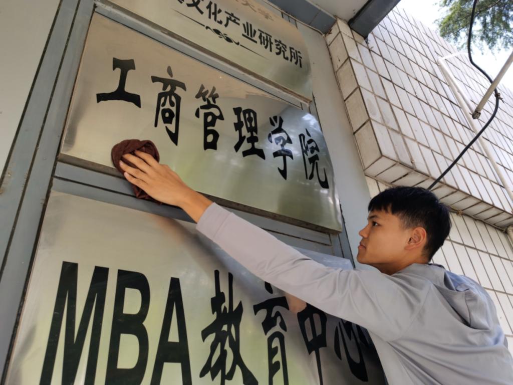 同学们负责打扫学院门口、擦净廊道窗户玻璃、清洗纱窗、擦除学院及其它单位牌匾上的尘土、清扫和拖洗地面,同学们积极参与,分工明确,互相配合,工作开展得井然有序。在义务劳动的过程中,同学们秉承着不怕脏不怕累的精神,手持抹布、拖把,仔细认真地将学院的各个角落都打扫干净。经过大家一下午的辛苦努力,学院已经变得焕然一新,同学们自觉地遵守团队秩序,积极传承和发扬了青年学生吃苦耐劳的精神品质。同学们纷纷表示,此次活动让他们充实了自己的大学生活,看到学院一点一点在他们共同的努力下变得干净,让他们体会到了劳动的快乐与奉献的意义。
