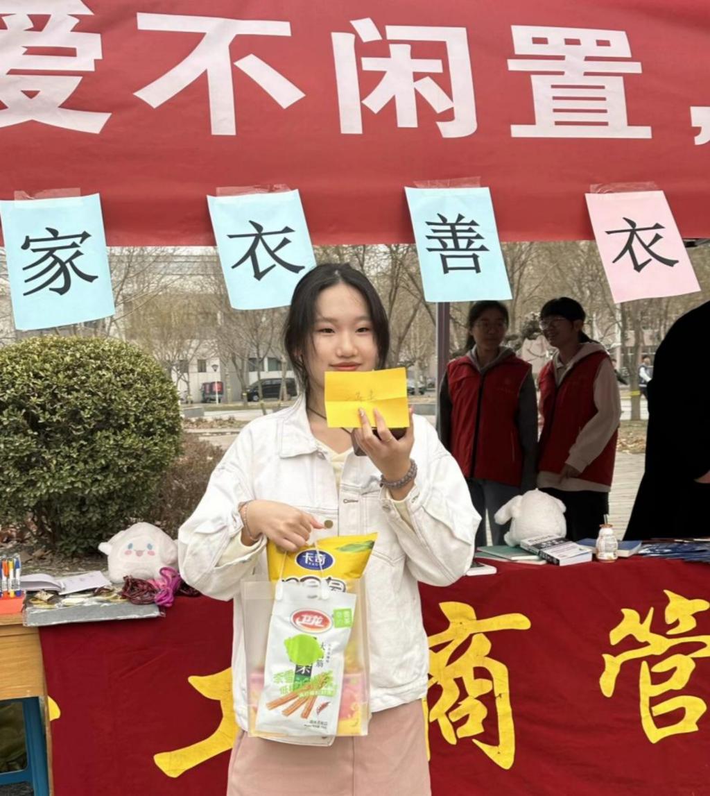 在活动现场,同学们络绎不绝地带着闲置的衣物前来捐赠,在志愿者的引导下将捐赠的各类衣物叠放整齐,井然有序地放置在捐衣点。同时,捐赠者还会在衣物上留下一张贴纸,在上面写下了对需要帮助的人们最真挚的祝福。志愿者们分工明确,积极推广宣传,组织回收旧衣物,详细登记捐赠者的信息,并细致地解答捐赠者提出的问题。活动现场不仅是捐赠的地方,更是人们相互关怀、分享爱心的平台,每个人的参与都让这个活动变得更加有意义,现场工作人员闫徐琛说:“当捐赠者将他们的衣物交给我们时,我能感受到他们的善良和爱心,这种爱心不仅传递给了受赠者,也传递给了我们每一个参与活动的志愿者,这种传递让我感受到了社会的温暖和关怀的力量。”