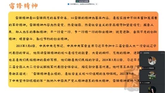 活动伊始,陈晓彤带领同学们回顾了雷锋精神的内涵。她介绍,雷锋精神的内涵丰富,包括爱党爱国爱社会主义的坚定信念、服务人民的奉献精神、精益求精的敬业精神、锐意进取的创新精神、艰苦奋斗的创业精神。她强调,雷锋精神是纳入中国共产党精神谱系的伟大精神,我们青年也要不断传承发扬雷锋精神,将其作为我们的精神纲领与行动指南。