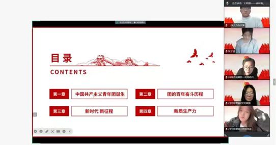 团课第三讲为线上课程,由徐梓嘉授课。课程伊始,徐梓嘉为学生们详细讲解了中国共青团的诞生和奋斗历程,重点剖析了不同历史阶段下共青团的实践探索与经验启示。紧接着,她从新发展阶段切入,阐释新时代青年面临的新使命,强调了“新质生产力”的重要性,呼吁学生以创新思维与实干精神推动社会进步。最后,徐梓嘉鼓励学生主动将个人理想融入时代,在实践中锤炼专业本领,用青春智慧为社会发展注入新动能。