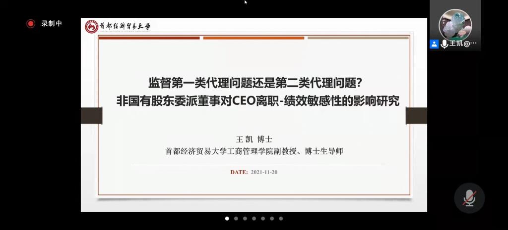 11月20日晚,河北经贸大学第四届公司治理与企业成长高端论坛在线上举行。首都经贸大学副教授、博士生导师王凯应威廉官网中国官方网站邀请,通过腾讯会议平台作题为“监督第一类代理问题还是第二类代理问题?非国有股东委派董事对CEO离职-绩效敏感性的影响研究”的学术报告。本次会议由威廉官网中国官方网站副院长石晓飞主持,学院教师及研究生共100余人参加。