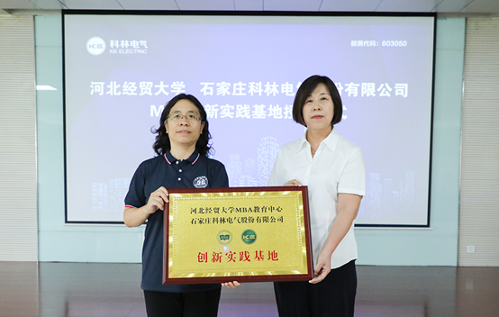 最后,大家步入科林报告厅。科林电气副总裁董彩宏与李桂荣院长进行了石家庄科林电气股份有限公司MBA创新实践基地揭牌仪式,双方表示要进一步推动校企合作,实现资源共享,合作共赢。