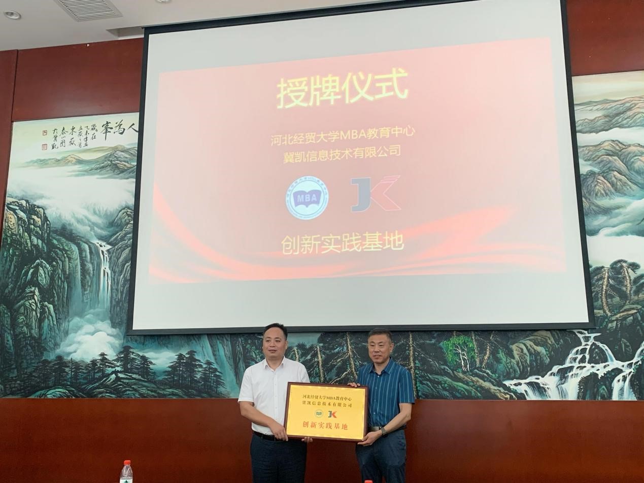 报告结束后,举行了河北经贸大学MBA教育中心创新实践基地揭牌仪式。桑银峰老师和魏二宏总经理共同为基地揭牌,冀凯信息技术有限公司正式成为河北经贸大学MBA教育中心的创新实践基地。
