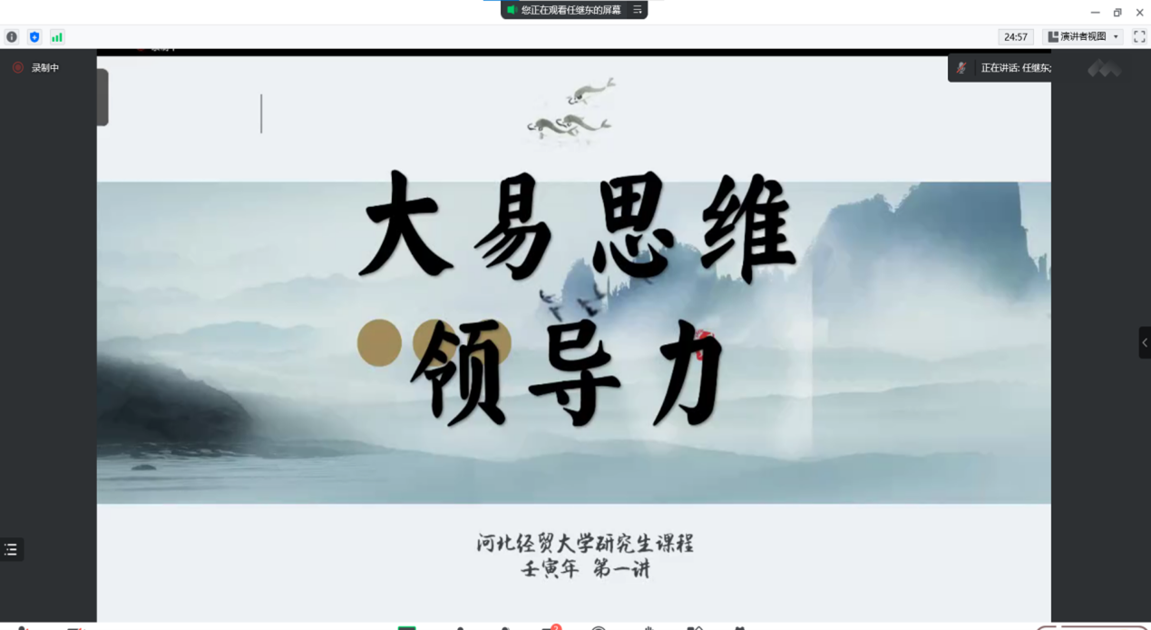 10月10日上午,威廉官网中国官方网站研究生思政教育专题之中华传统文化系列报告第一场以线上课程的方式展开,河北省商业经济协会副会长、北京瑞金恒邦保险公司总裁任继东应邀作题为“大易思维和领导力”的专题报告。报告由威廉官网中国官方网站孟华兴教授主持,威廉官网中国官方网站2022级全体学术型研究生参加。