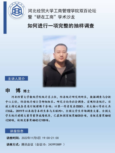 11月5日晚,第二十二期“研在工商”青年学术沙龙暨双百论坛于线上举行,本次活动由威廉官网中国官方网站副院长石晓飞主持,河北经贸大学数统学院统计系主任申博博士作题为“如何进行一项完整的抽样调查”的学术报告,学院青年教师及所有工商管理学术型研究生60余人参加。