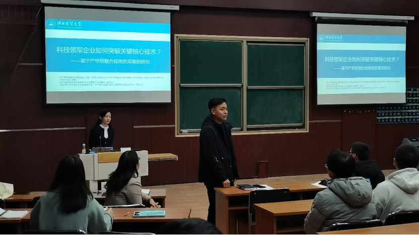 各位青年教师就张羽飞博士的研究选题、研究内容、研究方法等方面进行了讨论。李桂荣对报告进行了总结,称该研究结论丰富了产学研融合与关键核心技术突破的相关研究,对中国科技领军企业产学研深度融合突破关键核心技术的实践具有一定指导意义。