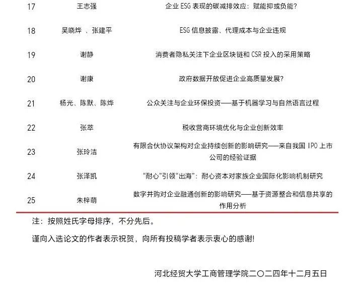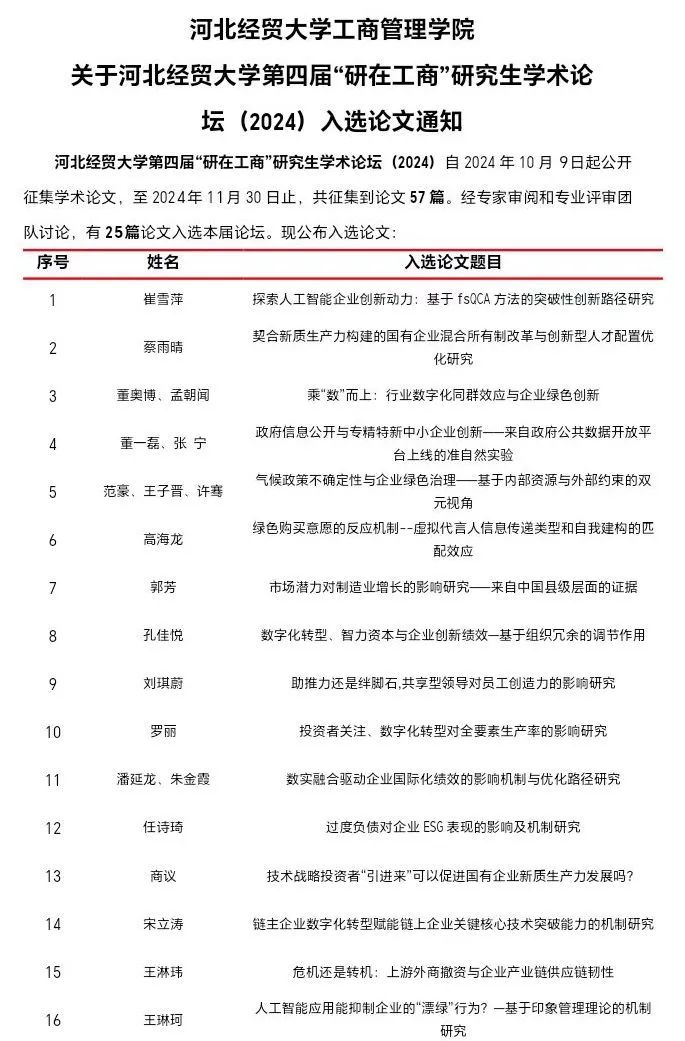 关于河北经贸大学第四届“研在工商”研究生学术论坛(2024)入选论文通知