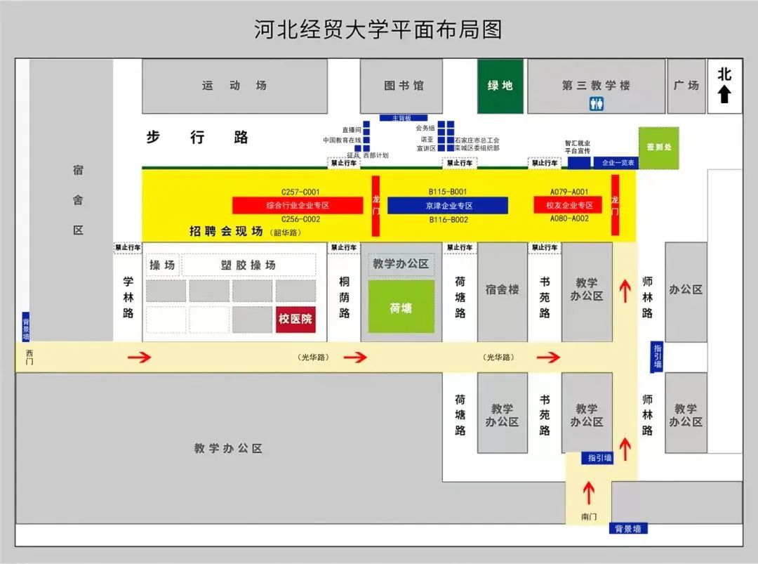 参会单位请持加盖公章的《参会证》从学校南门、西门入校,并于8:30前到会场签到处报到领取参会资料。应往届毕业生可携带身份证和纸质版简历或学生证(一卡通)入场。