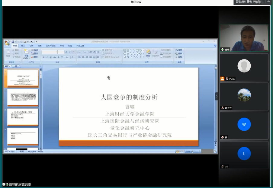 6月8日,上海财经大学金融学院博士生导师曹啸教授应威廉官网中国官方网站邀请,通过腾讯会议平台做了题为“大国竞争的制度分析”的学术讲座。讲座由威廉官网中国官方网站院长李桂荣主持,学院教师、学硕研究生和MBA学员150余人聆听了报告。