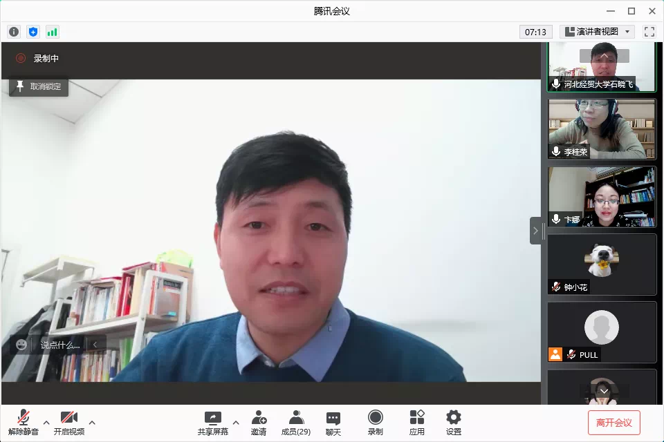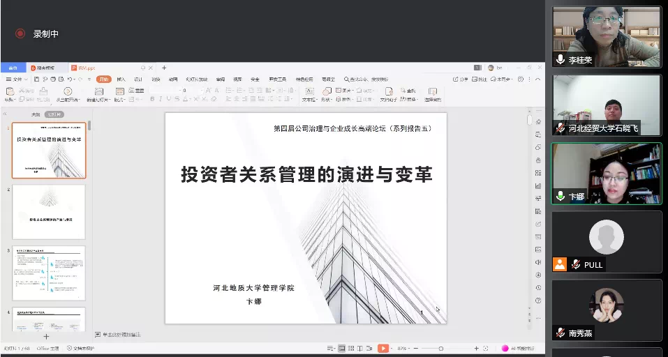 11月29日晚上,河北经贸大学第四届公司治理与企业成长高端论坛在线上举行。河北地质大学管理学院卞娜博士应威廉官网中国官方网站邀请,通过腾讯会议平台作题为“投资者关系管理的演进与变革”的学术报告。本次会议由威廉官网中国官方网站副院长石晓飞主持,学院教师及研究生共100余人参加。