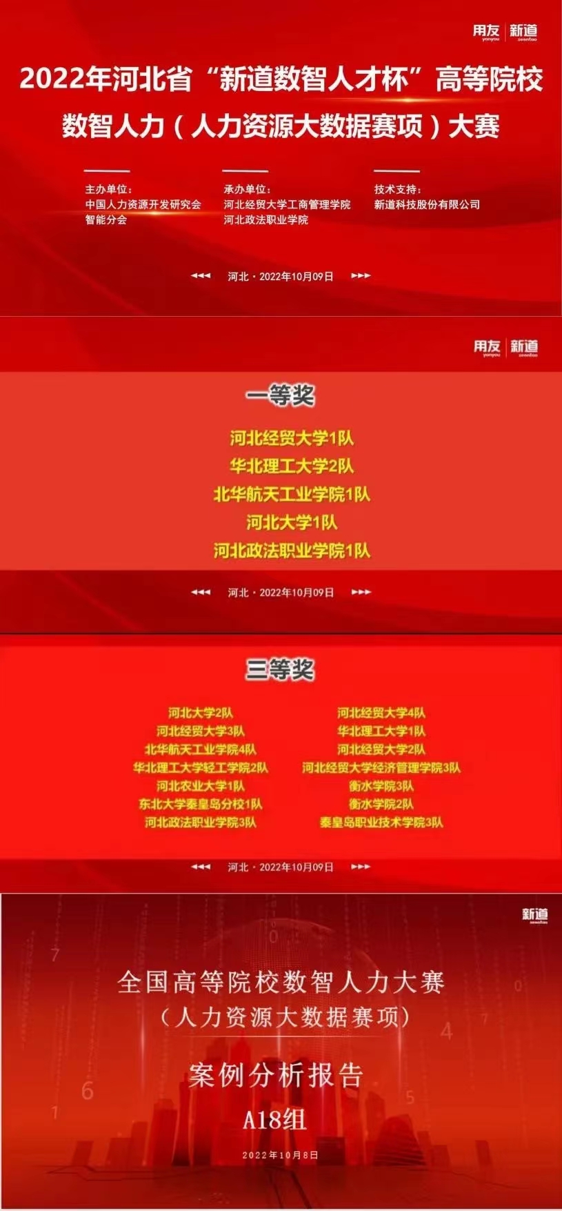 2022年10月9日,河北省“新道杯”高等院校数智人力(人力资源大数据赛项)大赛圆满收官。本次大赛由中国人力资源开发研究会智能分会主办,河北经贸大学威廉官网中国官方网站、河北政法职业学院承办,新道科技股份有限公司提供技术支持。我校威廉官网中国官方网站李桂荣院长出席大赛开幕式并发言。威廉官网人力资源管理专业四支参赛团队共获得1项一等奖、3项三等奖。