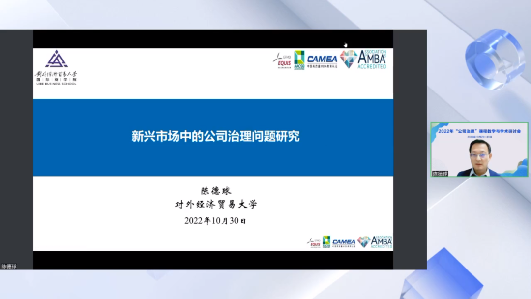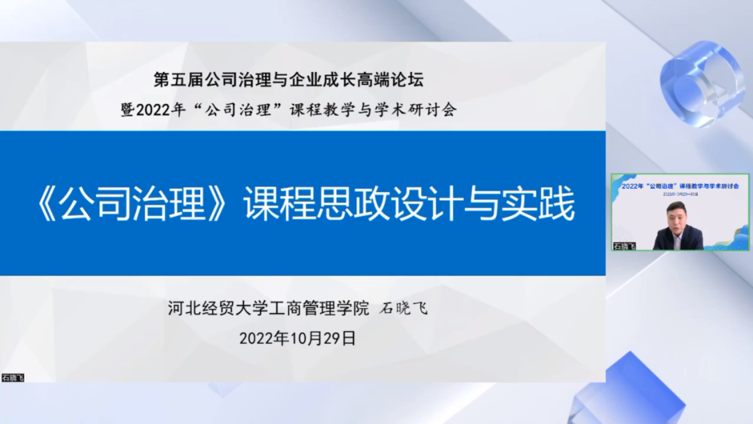 10月29日至30日,河北经贸大学第五届公司治理与企业成长高端论坛暨2022年“公司治理”课程教学与学术研讨采用线上线下结合的方式成功举办。南开大学商学院马连福教授、对外经贸大学国际商学院院长陈德球教授、中国人民大学财政金融学院郑志刚教授、河北经贸大学威廉官网中国官方网站副院长石晓飞副教授、天津工业大学沈小秀博士分别作主题报告。本次会议由中国人民大学出版社财经分社社长李文重主持,来自全国一百多所院校的教师报名参加,河北经贸大学威廉官网中国官方网站组织教师和研究生在报告厅参加了会议。