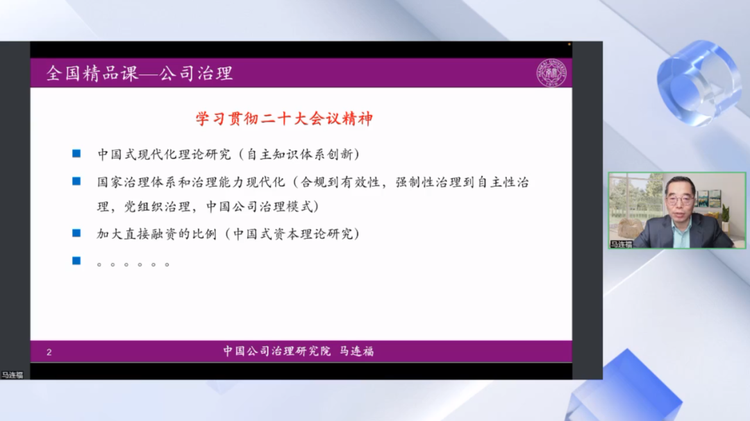 10月29日上午,马连福教授作题为“如何讲好《公司治理》课程”的报告。首先,从二十大精神出发,归纳出公司治理课程的整体特点,并提出公司治理课程的特点是“顶天立地”。其次,从公司治理与财务管理、会计学、战略管理、营销管理和人力资源管理等课程的联系展开,依次讲解这些课程与公司治理课程的内在联系。最后,展示了公司治理课程的思维导图和概念框架,同时以华为举例,从公司治理角度分析华为强大的原因,并总结了公司治理难点。指出讲好公司治理课程需要多层面准备,并与业内专家多交流研讨。