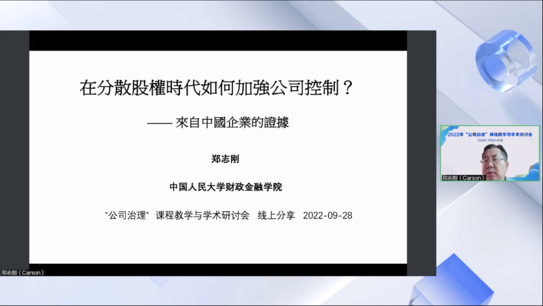 陈德球报告从公司治理传统研究脉络、中国上市公司治理现状、科学研究公司治理问题和新经济时代的公司治理学术研究四个方面展开。首先,提出公司治理存在的三类代理问题,第一类聚焦于股权分散下外部股东与内部管理层的矛盾;第二类聚焦于股权集中下大股东与中小股东的矛盾;第三类聚焦于将政府角色纳入分析框架。这三类代理问题构成了目前公司治理研究的基本脉络。其次,立足本国实际,提出中国情境下的公司治理问题。同时表示我们一定要科学的研究公司治理问题,不仅研究问题要新颖,而且研究方法要科学可靠,做到理论和方法的双重创新。最后,提出在新时代经济背景下,研究公司治理问题要贴合中国实际,深入了解中国制度环境背景,了解公司治理理论范式的变化。
