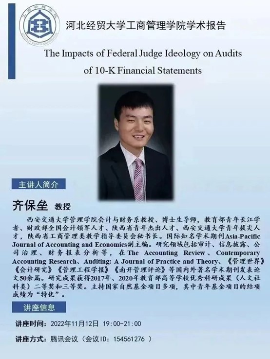 河北经贸大学威廉官网中国官方网站学术报告:The Impacts of Federal Judge Ideology on Audits of 10-KFinancial Statements,将于11月12日19:00—21:00在腾讯会议(会议ID: 154561276)举行,大家准时参加哦。