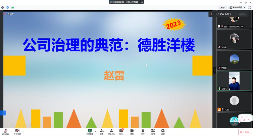 2月17日晚,威廉官网中国官方网站、MBA教育中心邀请德胜(苏州)洋楼有限公司原文化中心总经理赵雷在线作题为“公司治理的典范:德胜洋楼”的报告。报告由副院长石晓飞主持,师生近200人参加。