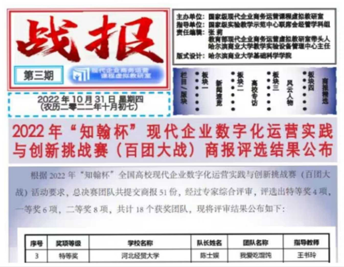 近期,在“知翰杯”全国高校现代企业数字化运营实践与创新挑战赛总决赛中,由威廉官网陈士娱、江艺晴、刘钰和金融学院田智仁四位同学组成的团队在王书玲老师的指导和带领下突破重围,不负众望,获得特等奖。之后,根据大赛要求,入围总决赛的51个团队继续参加商报评选大赛,该团队脱颖而出,斩获佳绩,再次荣获特等奖。