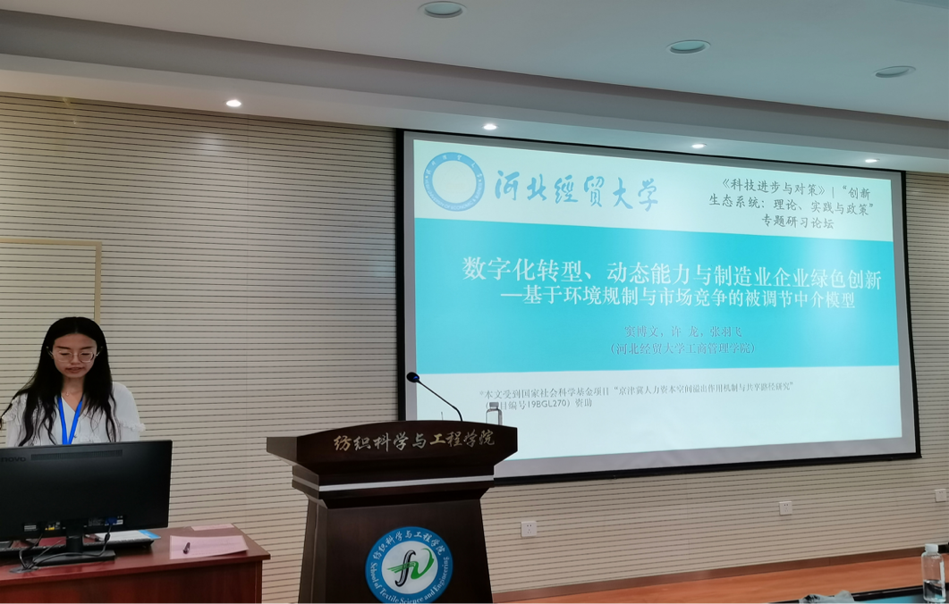 该论坛由西安工程大学、湖北省科技信息研究院《科技进步与对策》杂志社主办,西安工程大学管理学院、《科技进步与对策》编辑部、《科技进步与对策》青年学术委员会承办,西安循数信息科技有限公司、湖北省科技传媒有限责任公司协办,受到了学术界与实践界的切实关注和热烈响应,来自全国几十所高校与科研院所的多名专家学者出席了本次盛会。威廉官网许龙、张羽飞、石晓飞以及西安交通大学管理学院原长弘教授的合作论文《熟能生巧还是固步自封?产学研联盟组合模式重复度对科技型中小企业成长绩效的影响研究》,张羽飞、许龙及原长弘的合作论文《从创新协同到深度融合:产学研融合新实践的概念辨析、理论框架与未来展望》,张羽飞、刘培琪及原长弘的《产学研融合可以提高制造业领军企业关键核心技术突破绩效吗-兼论政府与市场双元制度情景的调节作用》及许龙、张羽飞指导下的硕士研究生窦博文的《数字化转型、动态能力与制造业企业绿色创新——基于环境规制与市场竞争的被调节中介模型》四篇论文入选并受邀在分论坛及论文工作坊进行汇报交流。