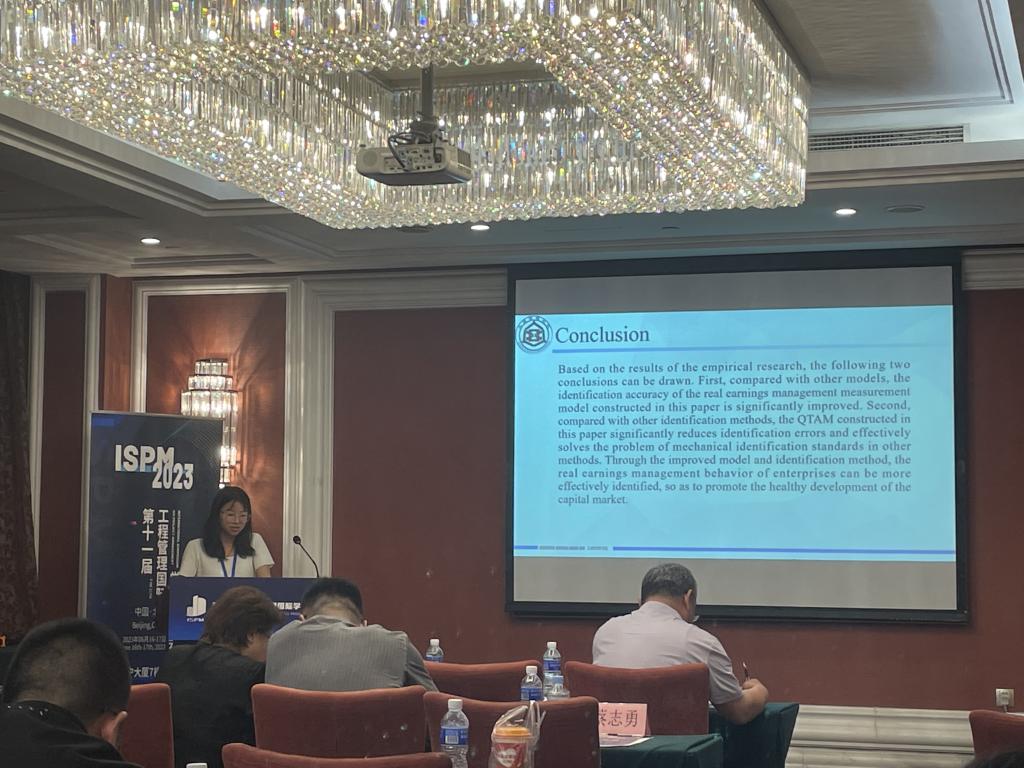 2023年6月17日,第十一届工程管理国际学术研讨会(ISPM 2023)在北京辽宁大厦成功召开。此届会议由北京工程管理学学会、湖北省众科地质与环境技术服务中心、北京建筑大学工程管理研究所和北京建筑大学城市经济与管理学院联合主办,国内外千余位师生参加,35篇论文作者现场报告了最新研究成果。威廉官网研究生靳玉的论文Measurement Models and Identification Methodology of Real Earnings Management—Empirical Research Based on the Data of Chinese A-share Listed Companies入选,并受邀在会议现场进行了报告。