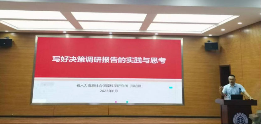 首先,邢明强简单介绍了决策调研报告的特点,指出报告要针对现实问题,可以从经济、社会、养老、人才等现实问题出发,分析研究问题出现的原因,从而提出针对性的解决办法;其次,基于决策调研报告可操作性特点,强调其是为各级领导决策服务的,建议必须以实施部门认可和执行为基础,一定要能落地;再次,基于决策调研报告客观公正性特点,强调报告一旦被采纳,建议会演变成政府行为,还可能会转化成政策,直接影响到社会利益的分配,所以要务必客观公正。最后,结合自己完成的决策调研报告,为各位老师撰写决策调研报告给出了一系列建议。