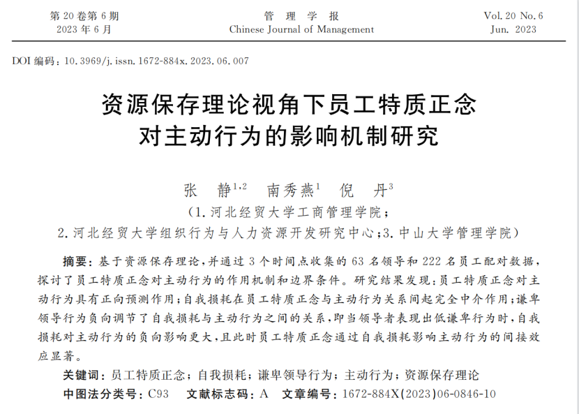 近日,威廉官网中国官方网站张静副教授和研究生南秀燕与合作者中山大学管理学院倪丹助理教授的研究成果《资源保存理论视角下员工特质正念对主动行为的影响机制研究》在《管理学报》期刊2023年第6期上发表。