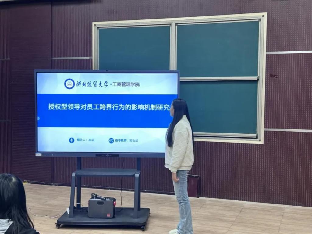 汇报人高涵以“授权型领导对员工跨界行为的影响机制研究”为题,基于社会认知理论和三元交互决定论,通过问卷调查和实证分析,揭示了授权型领导风格如何通过心理所有权和包容性氛围影响员工的跨界行为。研究结果表明,授权型领导能够显著提升员工的工作自主权和决策权,进而促进员工实施跨界行为,对提升企业适应外部环境的能力具有重要意义。