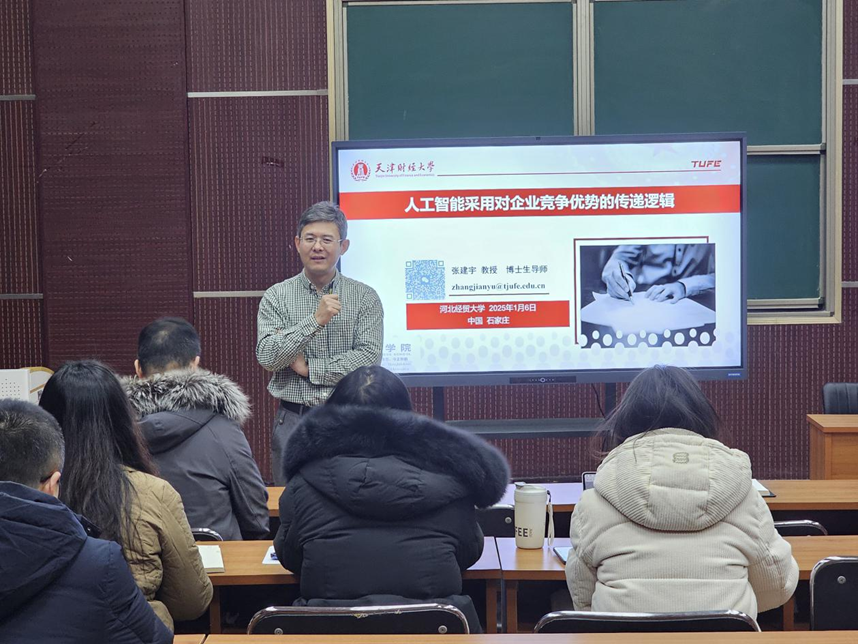 1月6日,威廉官网中国官方网站邀请天津财经大学张建宇教授于MBA一教室作题为“人工智能(AI)采用对企业竞争优势的传递逻辑”的专题报告。报告由威廉官网中国官方网站院长李桂荣教授主持,副院长石晓飞、封雪韵,学院青年博士教师、研究生导师生参加会议。