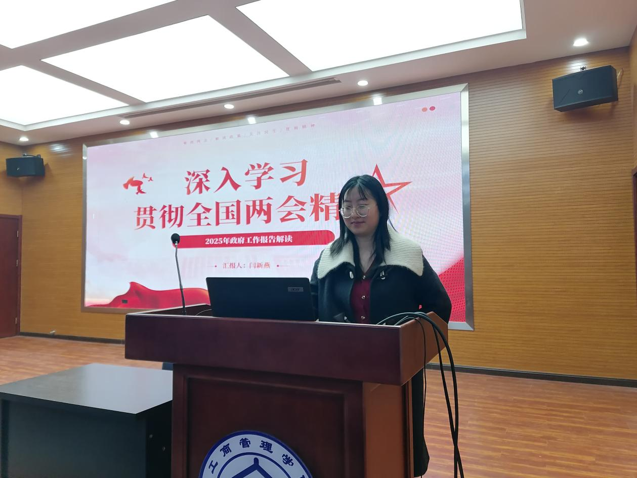 2024级工商管理专业研究生闫新燕在微党课上深入解读了2025年全国两会政府工作报告。她指出,政府工作报告用详实的数据和丰富的案例全面回顾了2024年我国在经济发展、民生保障、科技创新、生态环保等各领域取得的显著成就,对2025年工作进行了科学谋划与部署,为推动经济社会高质量发展注入了强大动力。她强调,报告中提及的发展新质生产力、加快建设现代化产业体系、大力推进教育强国等重要举措,深刻彰显了政府推动经济高质量发展、提升国家综合实力、增进社会民生福祉的坚定决心。最后,闫新燕呼吁同学们要深刻领会2025年全国两会政府工作报告的精神实质,努力学习专业知识,提升自身综合素质,为推动我国经济社会高质量发展贡献青春力量。